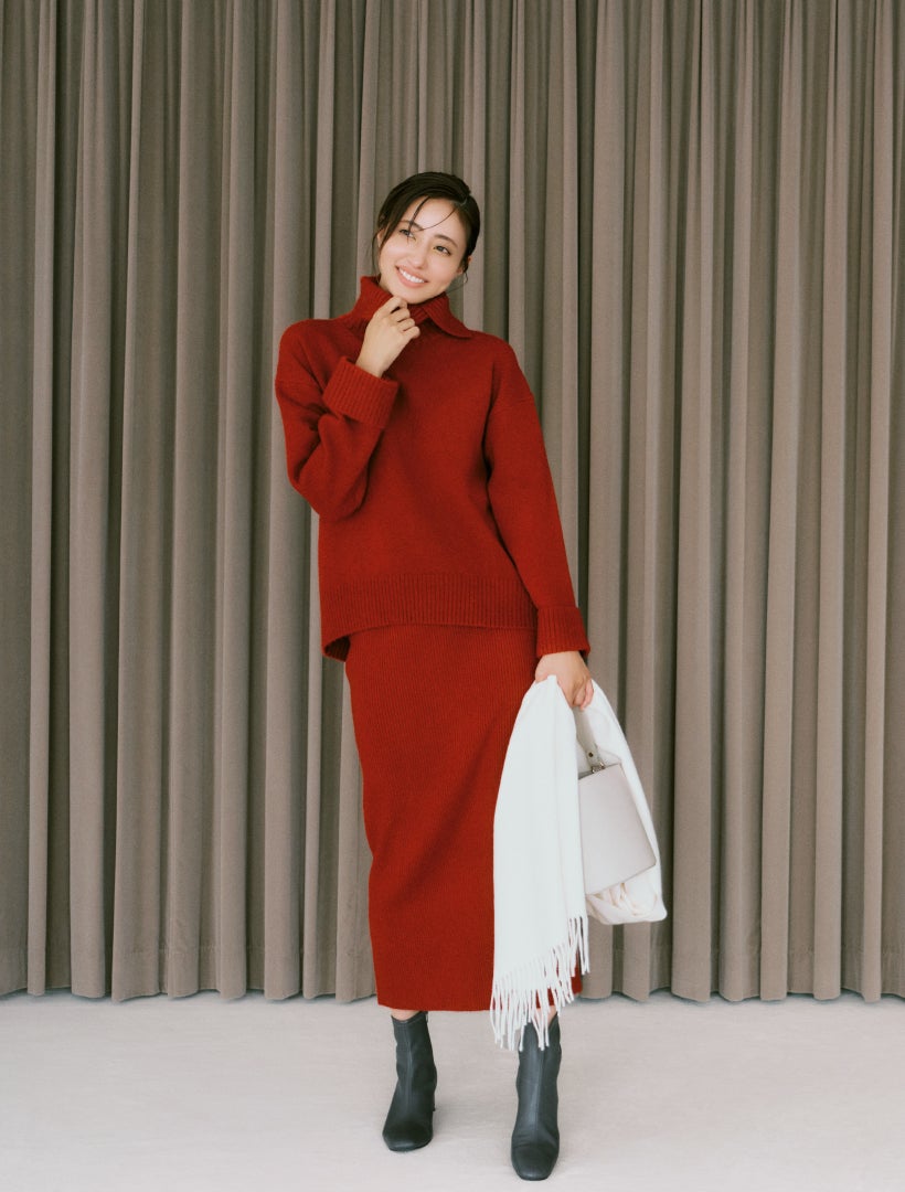 冬の定番ニットセットアップは、赤を選んでホリデーシーズンのハッピーな雰囲気を満喫。程よく地厚だからボディラインを拾わずノンストレス。