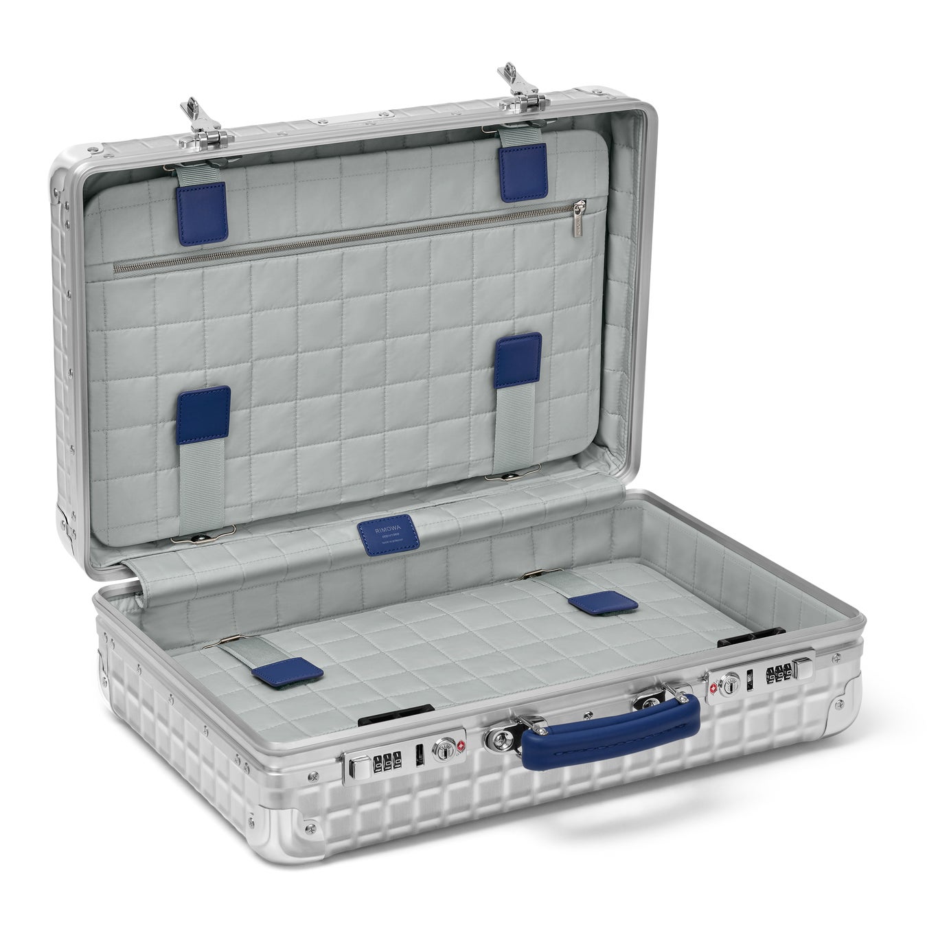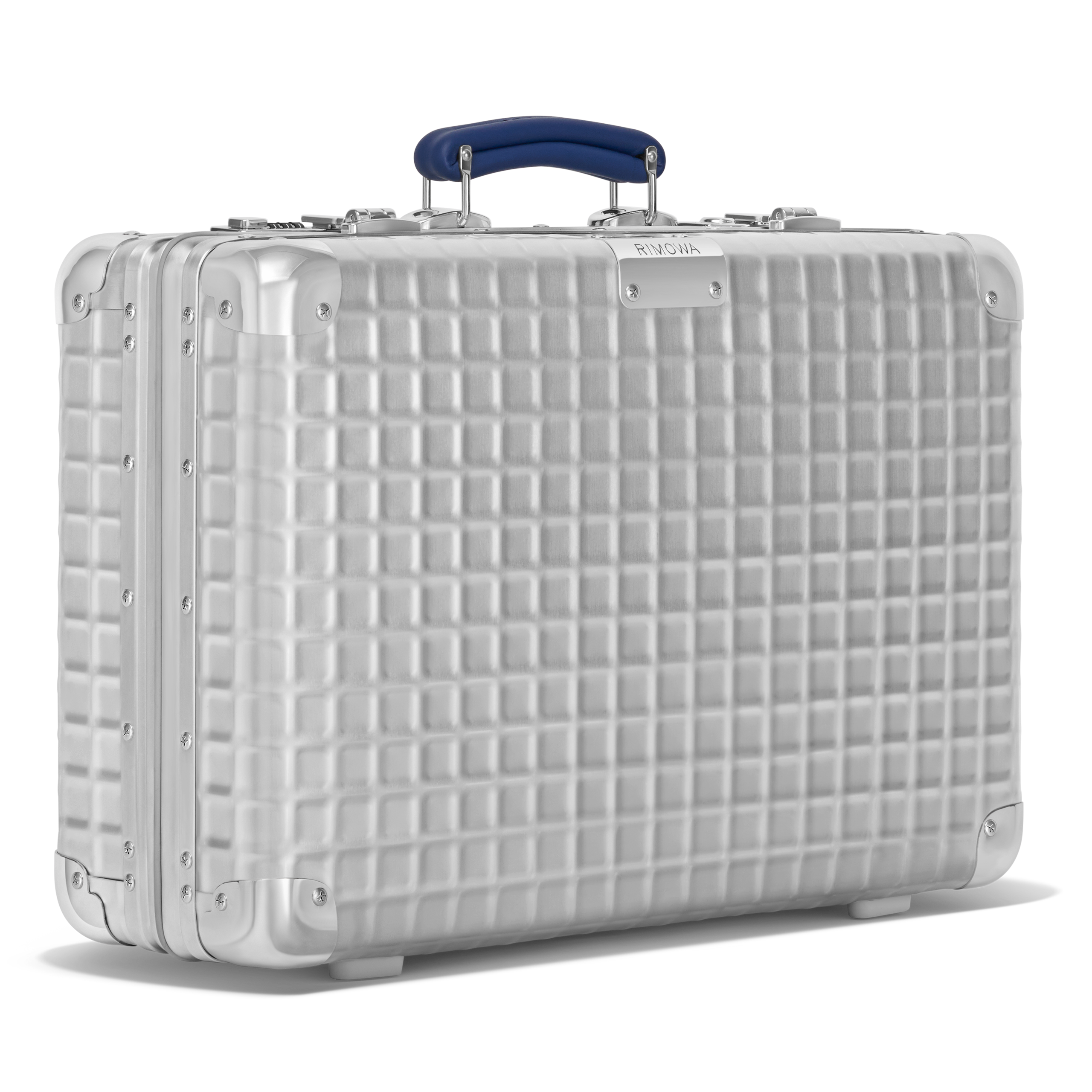 本コレクション最大の特徴は、シルバーのアルミニウムにプレス加工された、エンボス仕様のグリッドパターンです。 RIMOWAのエンジニアリングが誇る強度と耐久性を維持したこのパターンデザインは、見る人に強い視覚インパクトを与えます。また、内装には、グリッドパターンを反映したソフトなキルティングライニングと上質なレザーディテールが用いられており、外面と内装とで統一された高いデザイン性をお楽しみいただけます。