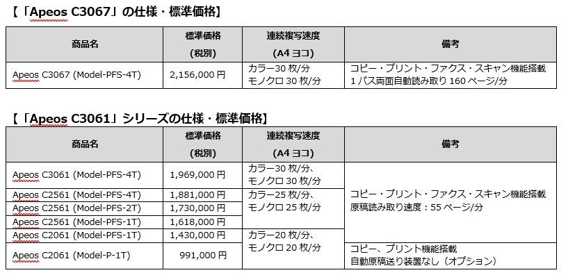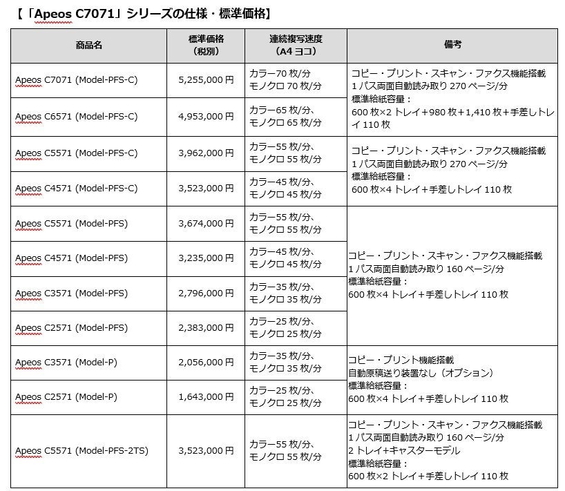 富士フイルムビジネスイノベーション株式会社(本社:東京都港区、代表取締役社長・CEO:浜 直樹)は、業務ソリューションとの連携を強化したA3デジタルカラー複合機「Apeos」シリーズの3機種10商品を、10月21日から発売します。今回発売する3機種のうち「Apeos C7071」シリーズは、A3デジタルカラー複合機の商品ラインアップを一新するフラッグシップモデルで、「Apeos C3067」と「Apeos C3061」シリーズは中小企業向けのコンパクトモデルです。「Apeos C3067」では、お客様の業務効率化を支援する複合機追加型アプリケーションを標準搭載し、「Apeos C3061」シリーズでは、複合機の基本機能に加え、さまざまなトレイ構成でお客様の使い方に柔軟に合わせることが可能です。富士フイルムビジネスイノベーションは、お客様の用途にあわせた同3機種の販売を通じ、オフィスのDX(デジタルトランスフォーメーション)を支援します。