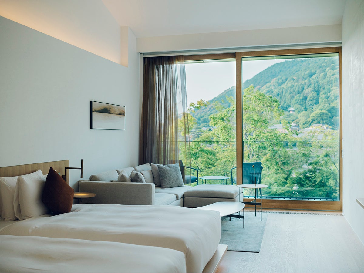 遥か遠い昔からいつの時代も人々を惹きつけてきた嵐山、渡月橋の目の前に位置。安田アトリエの安田幸一建築と内田デザイン研究所による「間と余白」の美しさ、「西洋と東洋」「伝統と現代」を融和した、天然素材と繊細かつミニマルな均整美で細部までこだわり抜いた居心地の良い空間。北山杉や水尾の柚子など京都素材のオリジナルプロダクツを使ったSPA、デュカス・パリが監修する、ミシュラン一つ星のフレンチレストラン「MUNI ALAIN DUCASSE」と「MUNI LA TERRASSE」を併設し、京都ならではの至高のモダンフレンチを味わうひと時をお楽しみいただけます。嵐山の自然と調和し、嵐山の歴史に新たな彩りを添える、嵐山の豊かな自然と無垢で優しい色調が調和する全21室のホテルです。