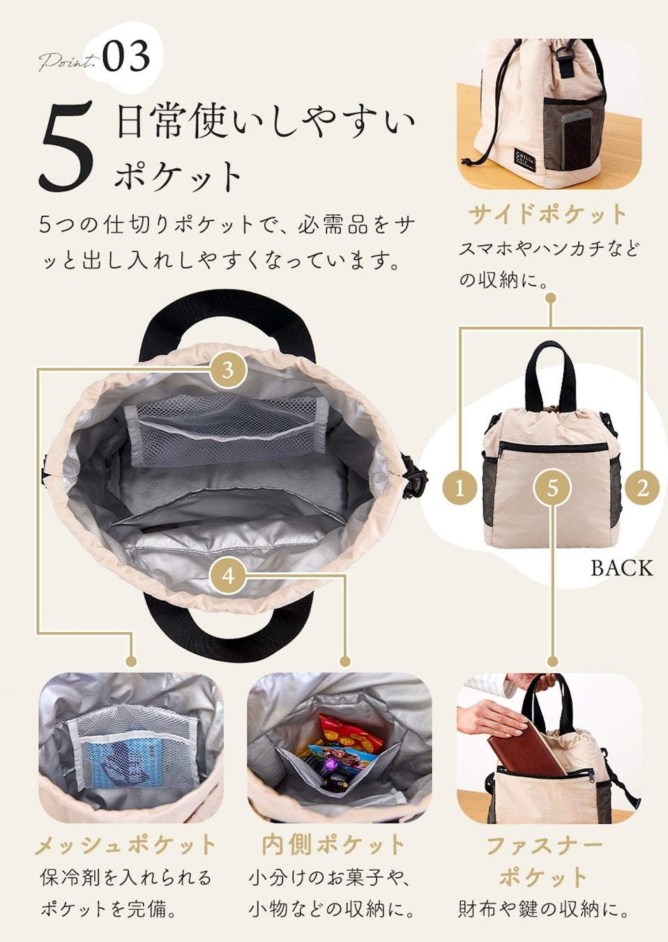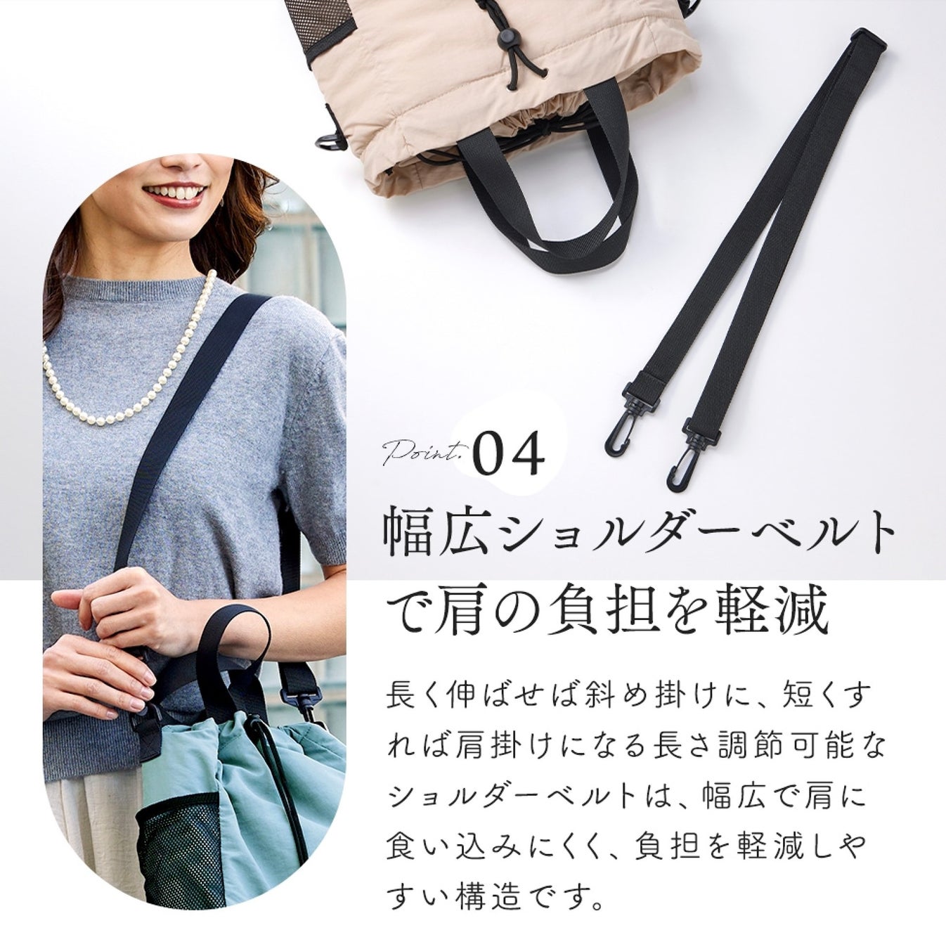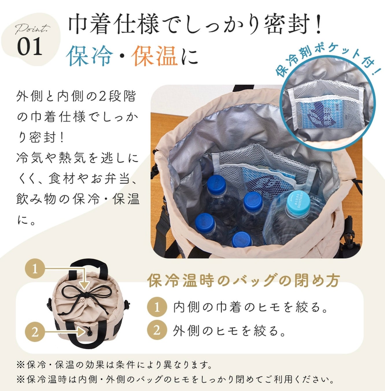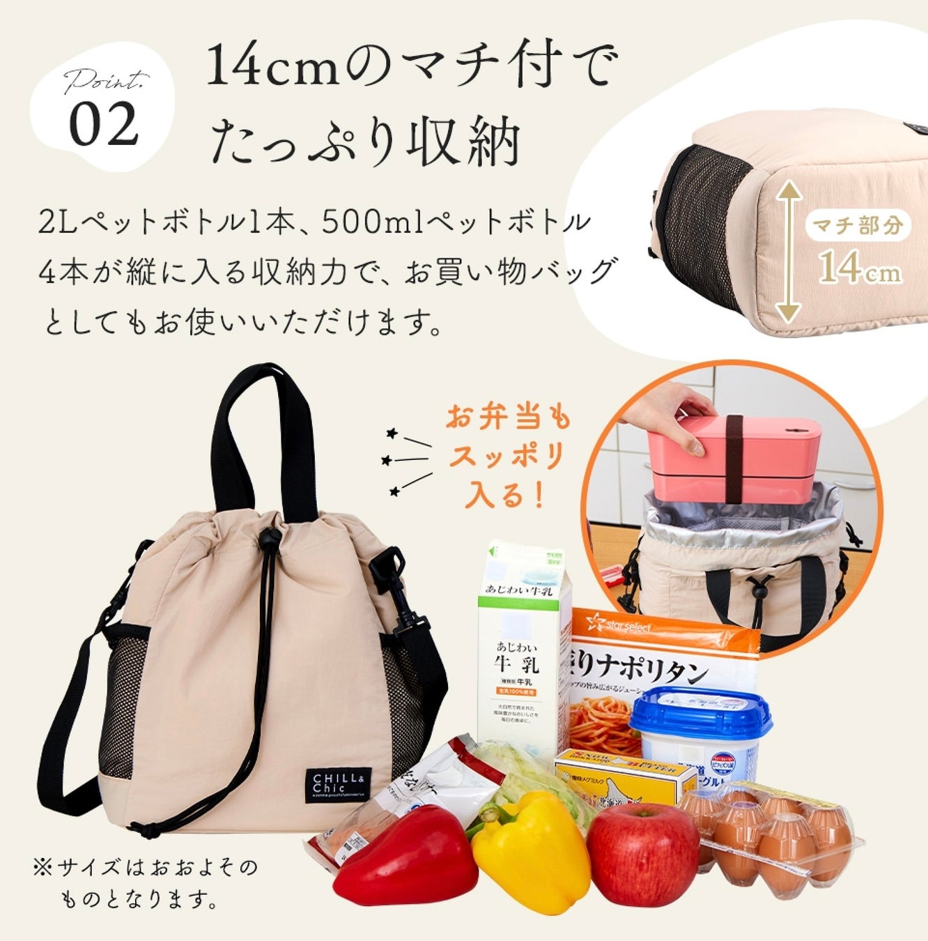 やわらか生地でカジュアルな保冷温機能付ショルダーバッグ。約14cmのマチでたっぷり収納でき、お買い物をはじめレジャー・アウトドアなどいろんなシーンで大活躍!取り外し可能なショルダーベルトは幅広で肩に食い込みにくい仕様。肩掛けや斜め掛けで両手があくのも便利なポイントです。表生地は水をはじきやすいはっ水加工。