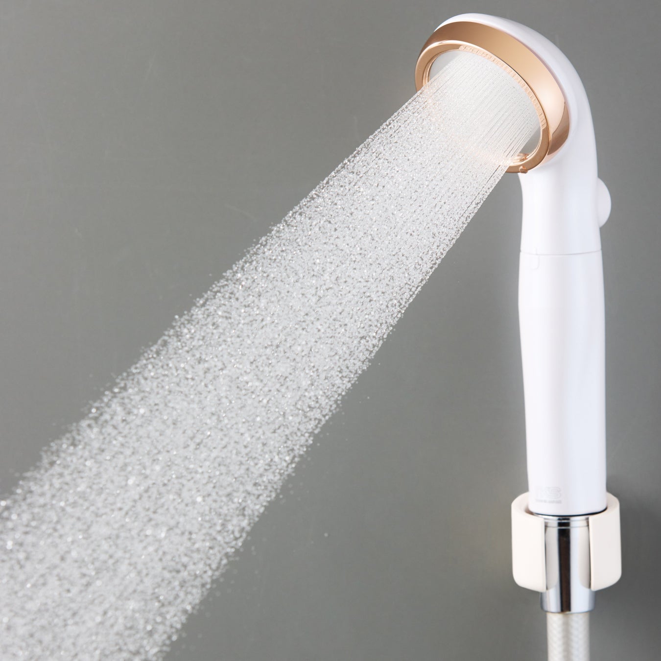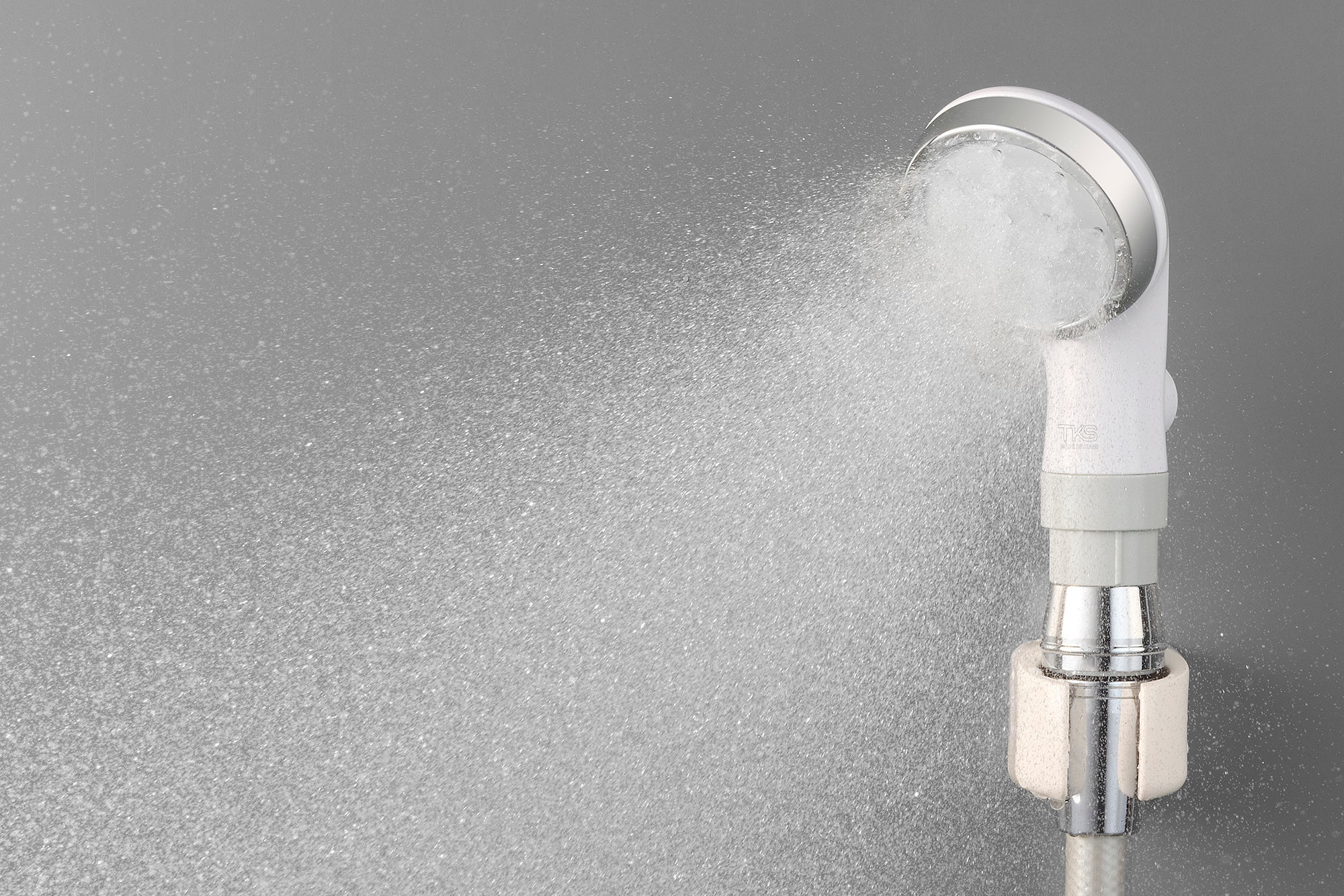 ミストしか出ないシャワー。散水板全面から噴霧するミストは雑味なくなめらかな浴び心地。濃密であたたかなミストが発生します。角層水分量を約15%UPさせて30分後もうるおいが続きます(※3)。