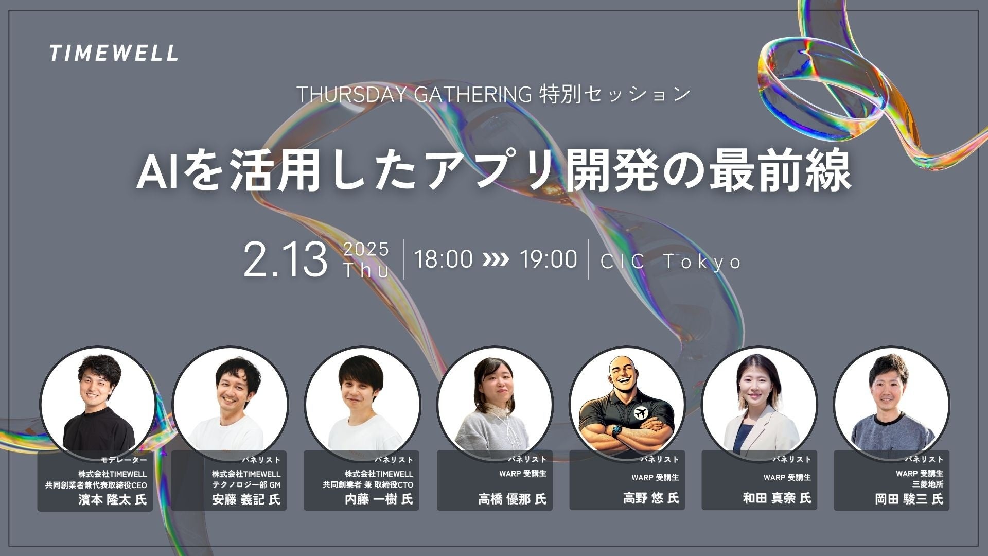 株式会社TIMEWELL(本社:神奈川県横浜市、代表取締役:濱本隆太、以下TIMEWELL)は、プログラミング初心者を対象としたイベント「AIを活用したアプリ開発の最前線」を2025年2月13日(木)に開催することをお知らせいたします。TIMEWELLはエンジニア未経験者がAIを活用し自らアプリ開発できるようになる若手テクニカルアントレプレナー育成プログラム「WARP」を運営しており、AIツールをどのように活用し、どのような課題に直面し、それをどう乗り越えてきたのかをリアルな体験談とともにお届けします。