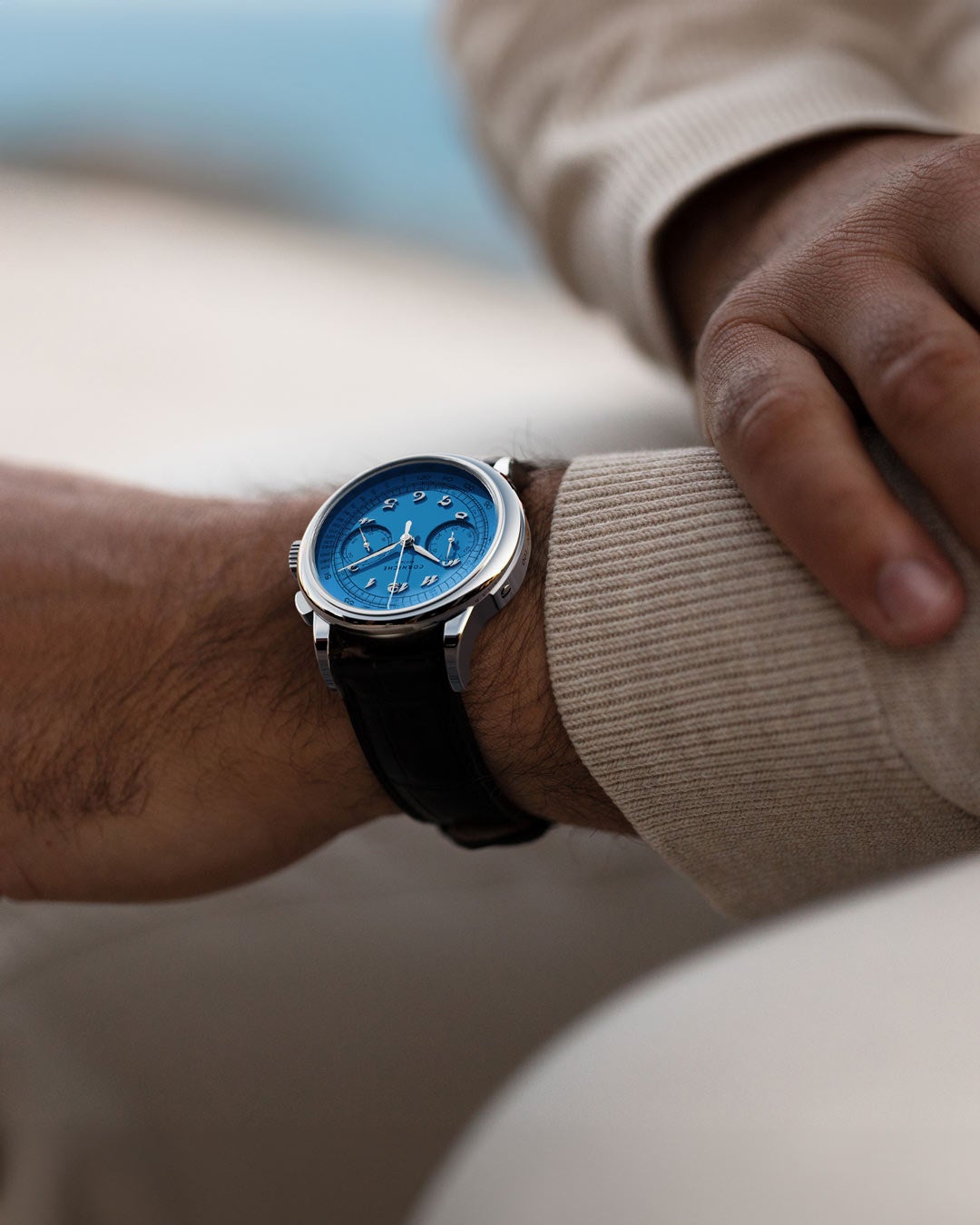 今回の第6弾では、コート・ダジュールの風景を彷彿とさせる色鮮やかなアズールブルーのセラミックダイヤルを採用し、光の角度によって豊かな表情を見せる。
