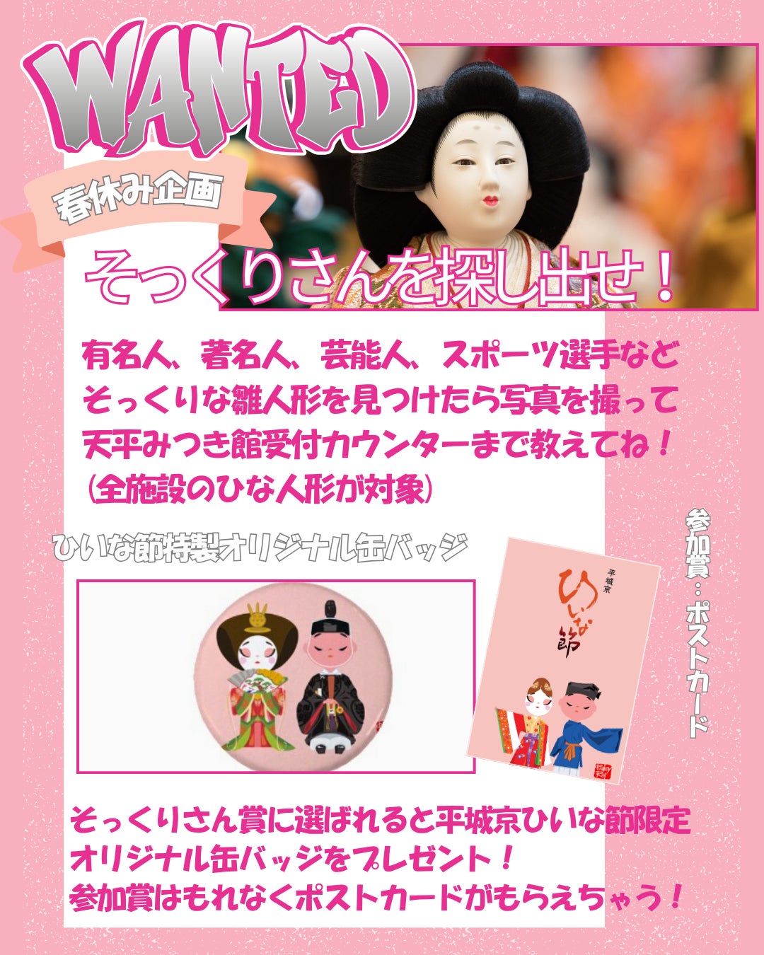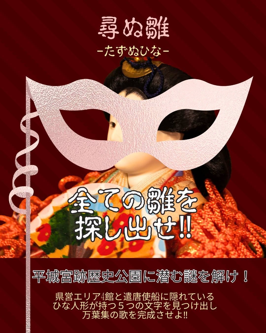 最終日の4月12日まで春休み企画として、有名人にそっくりな雛人形を探したり 全施設に隠されたおひな様の持つワードを繋げて歌を完成させてり、天平衣装に 身をまとい平城京を散策したりと盛りだくさん!