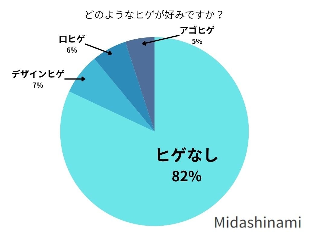 女性が好きな男性のヒゲについては、82%の女性が「ヒゲなし」を好み、7%が「デザインヒゲ」、6%が「口ヒゲ」、5%が「アゴヒゲ」を支持しているそうです。