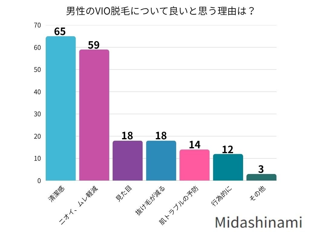 女性が男性のVIO脱毛を良いと思う理由は、清潔感が65件で最も多く、次いでニオイ・ムレ軽減が59件と続きました。見た目と抜け毛の減少がそれぞれ18件、肌トラブルの予防は14件、行為的な配慮が12件、その他の理由は3件でした。