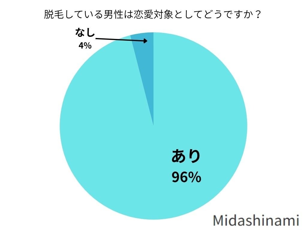 96%の女性が「脱毛している男性を恋愛対象とする」と回答し、わずか4%が「対象外」と答えました。この結果から、男性の脱毛は恋愛対象としてほぼ全員に肯定的に受け入れられていることがわかります。