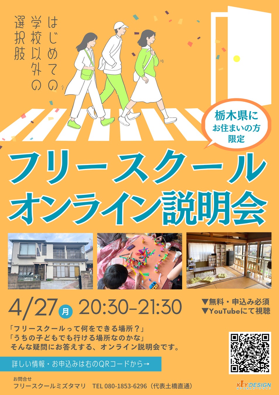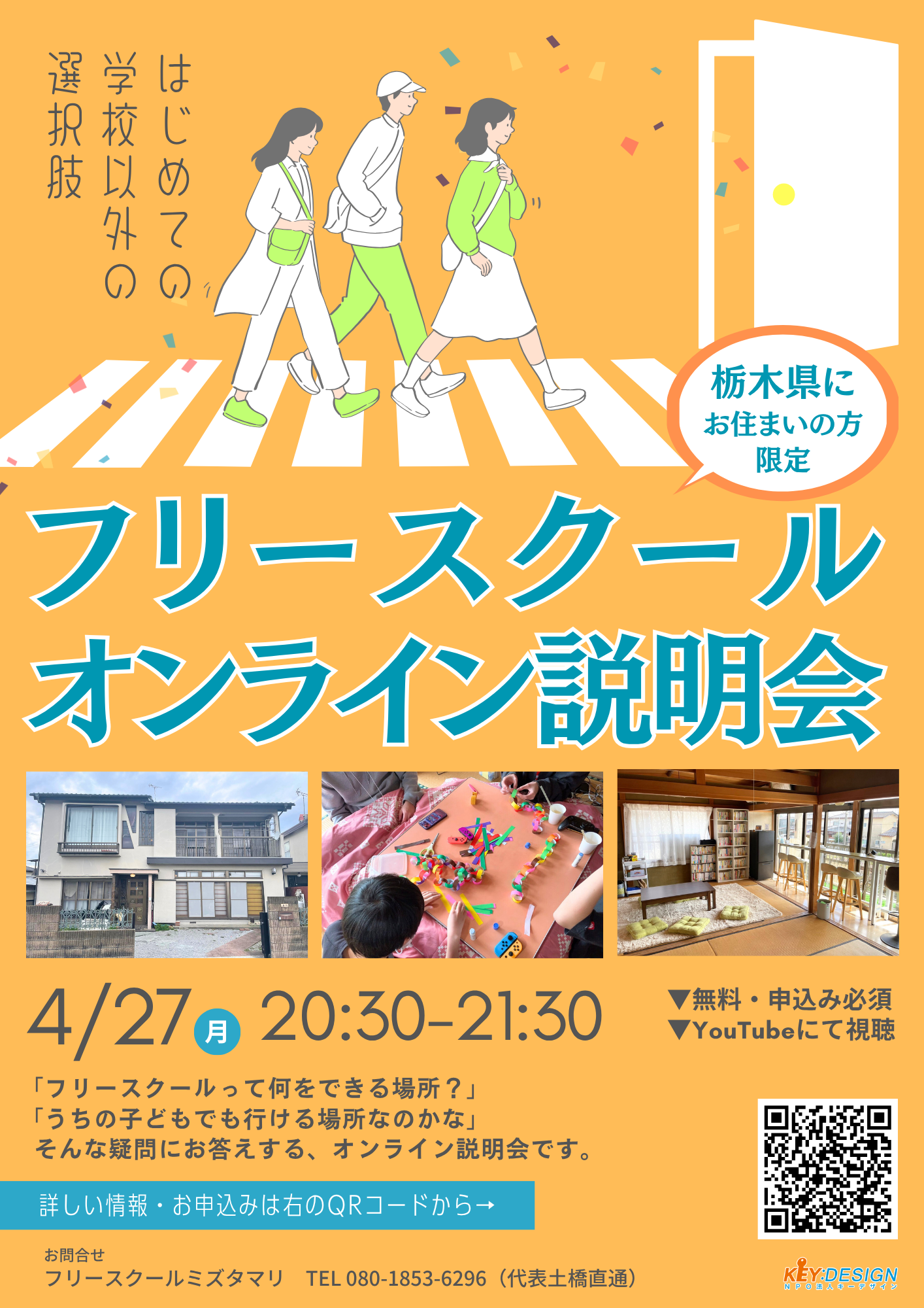 NPO法人キーデザイン(栃木県宇都宮市、代表理事:土橋優平)は、不登校や行き渋りの子どもを持つ保護者を対象に、「フリースクールオンライン説明会」を2026年4月27日(月)20:30〜21:30にYouTubeライブ配信にて開催いたします。