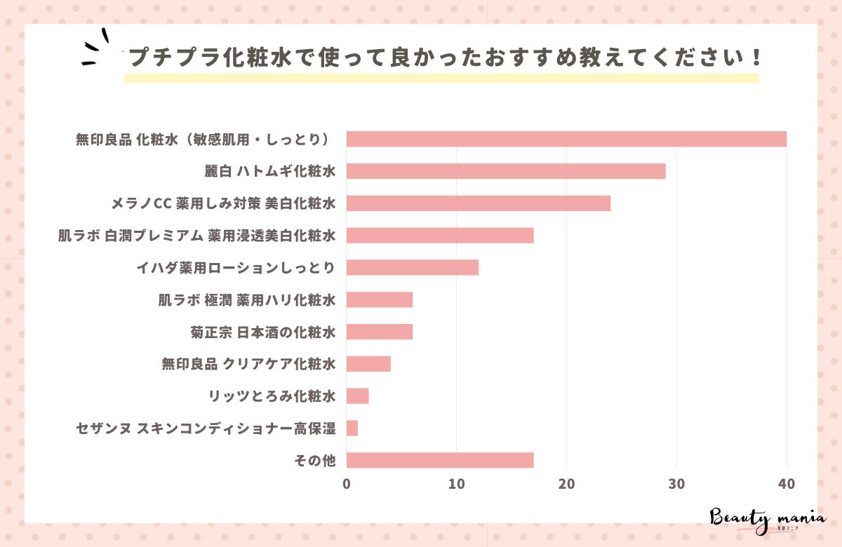 「プチプラ化粧水で使って良かったおすすめ教えてください!」とアンケート調査した結果、1位は『無印良品 化粧水・敏感肌用・しっとりタイプ(40人)』、2位は『麗白 ハトムギ化粧水(29人)』、3位は『メラノCC 薬用しみ対策 美白化粧水(24人)』となっています。
