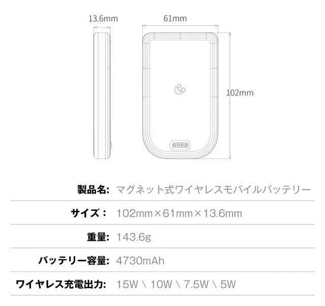 モバイルバッテリーの重さはわずか143.6gで、iPhone13なら1回分以上、iPhone SE(第3世代)なら2回以上フル充電可能。ワイヤレス充電が未対応のスマートフォンにはUSB-Cケーブルを利用しての充電も可能。