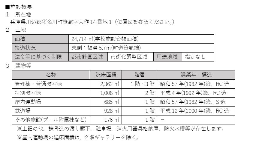 兵庫県猪名川町では、令和4年3月31日に閉校となった旧六瀬中学校跡地の有効活用について検討されており、地域の活性化や地域雇用の創出、地域貢献に寄与するなど、活用を通じて地域に新たな価値を創り出し、地域の持続的な発展に繋がる事業を提案実行する事業者を募集されていました。