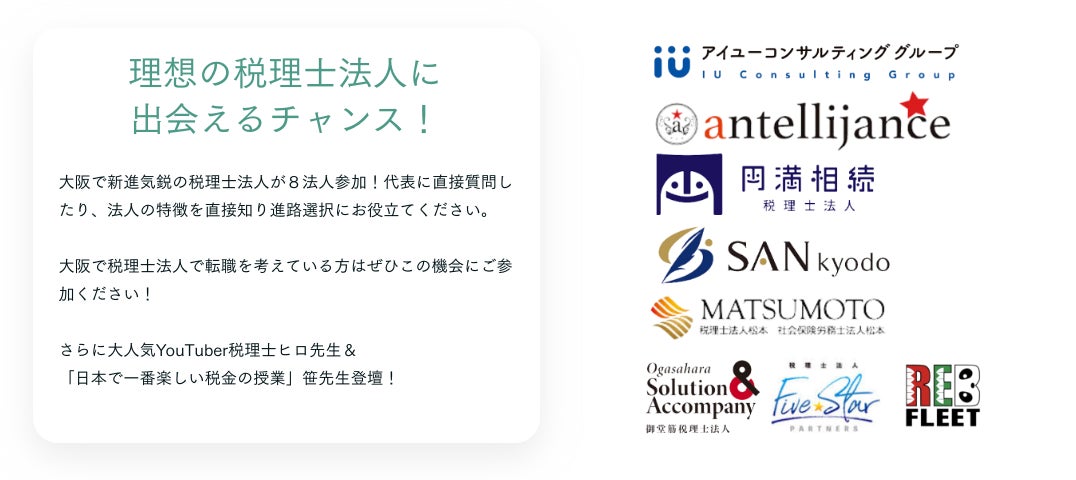 税理士試験の合格発表を待つ受験生向けに税理士法人アイユーコンサルティング(本社:東京都豊島区 代表者名:代表 岩永 悠/副代表 出川 裕基)が主催する「成長税理士法人 合同就職説明会」にサン共同税理士法人が出展いたします。