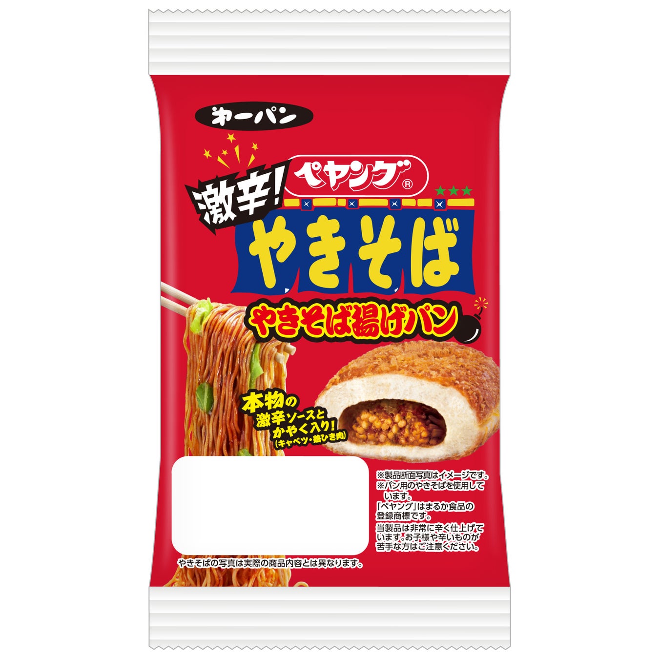 また今年は新たな味として、『ペヤング激辛やきそば』をイメージした「ペヤング激辛やきそば揚げパン」を開発しました。こちらも、実際の『ペヤング激辛やきそば』で使用されている本物の激辛ソースと“かやく”を使用し、本物の味を再現できるよう試作を重ねて完成しました。
