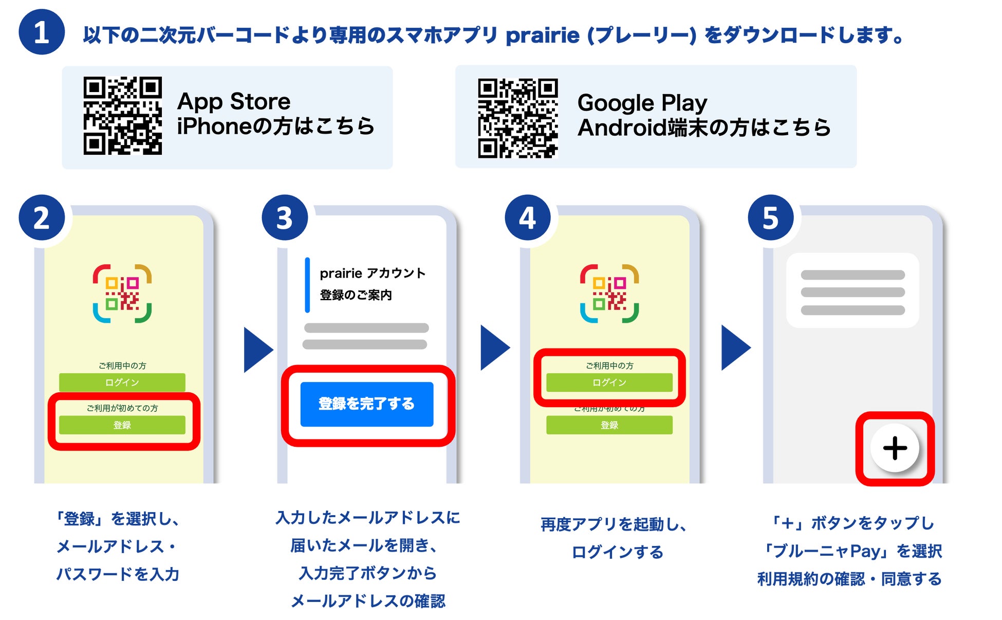 「ブルーニャ Pay」は、株式会社ミラボが提供する専用スマホアプリ「prairie」をダウンロードし、ポイントをチャージすることで、スマートフォンだけでスムーズにお買い物をお楽しみいただける「ポイントシステム」。
