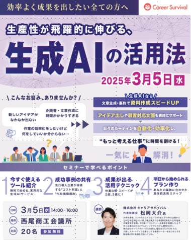 デジタル技術を活用し企業のDX推進を支援する株式会社キャリアサバイバル(本社:愛知県名古屋市、代表:松岡 大介)が、2025年3月5日(水)に愛知県西尾市の西尾商工会議所で開催されるセミナーに講師として登壇することが決定いたしました。