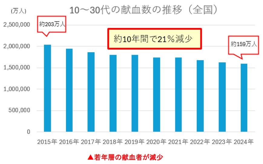 日本国内では、10~30代の献血者数は、この10年間で約21%減少(2015年約203万人→2024年159万人、約44万人減少)しており、若年層の献血離れが大きな課題となっています。本イベントは、若年層や献血への関心が薄い層を主な対象としています。