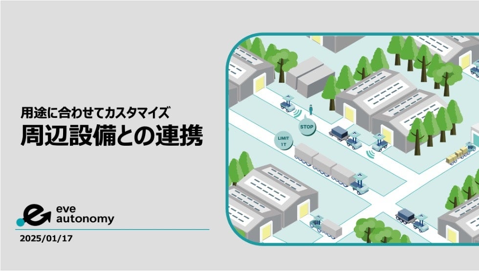 既に公式ウェブサイトに公開されている資料「周辺設備との連携」を大幅にアップデートし、eve autoと工場・倉庫などの設備との連携事例や導入メリットなどを紹介しています。今回の更新では、新たな導入事例や技術的な内容を追加し、eve autoの活用方法をより具体的にご理解いただける内容となっています。