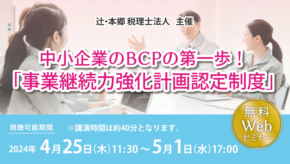 辻・本郷 税理士法人(本社:東京都新宿区、理事長:徳田孝司)は、2024年4月25日(木)より、「中小企業のBCPの第一歩!『事業継続力強化計画認定制度』」セミナーを開催いたします。能登半島地震を背景に、自然災害への備えがますます重要となっています。特に、中小企業が具体的な防災・減災プランを持つことは、事業の持続性において大変有益です。 また、認定を取得することで、取引先への信用力向上も期待できます。本セミナーでは、より効果的な事業継続力強化計画の策定方法や災害時のリスク軽減策について、専門家の講師がわかりやすく説明します。