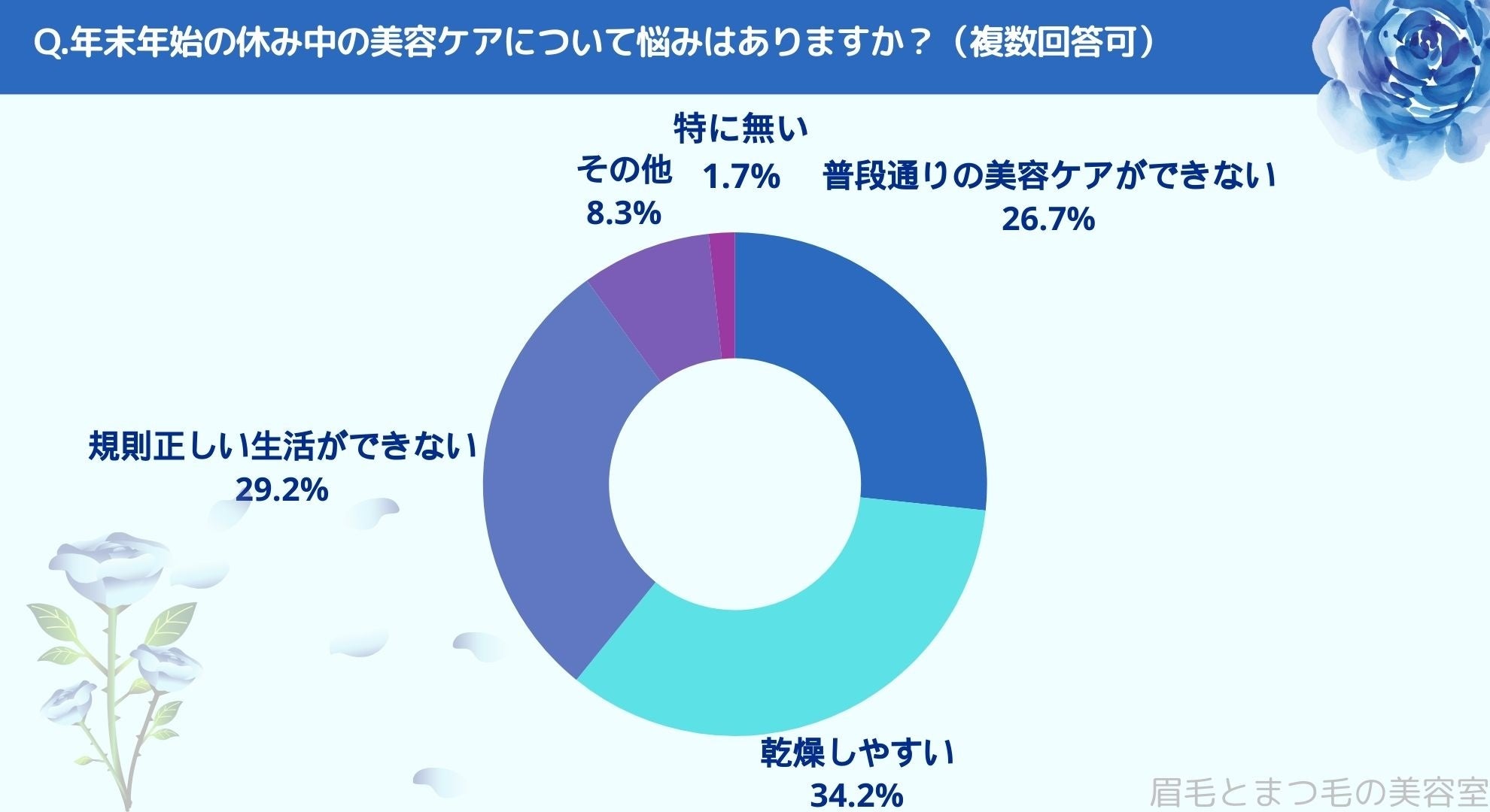 年末年始の休みの美容ケアで悩みがあるかお聞きしたところ「普段通りの美容ケアができない(26.7%)」、「乾燥しやすい(34.2%)」、「規則正しい生活ができない(29.2%)」、「その他(8.3%)」、「特に無い(1.7%)」という結果になりました。