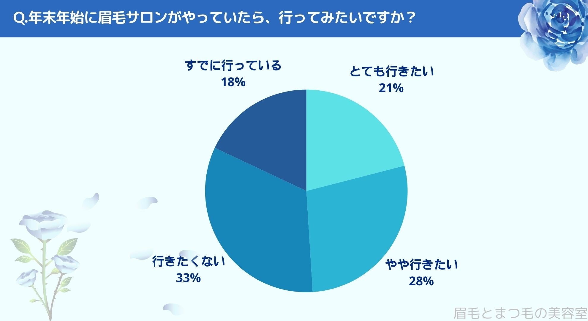 年末年始に眉毛サロンやっていたら行ってみたいかお聞きしたところ「とても行きたい(21%)」、「やや行きたい(28%)」、「行きたくない(33%)」、「すでに行っている(18%)」という結果になりました。