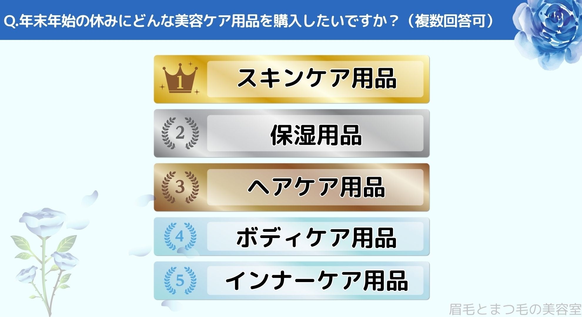 年末年始の休みにどんな美容ケア用品を購入するのかお聞きしたところ「1位>スキンケア用品」、「2位>保湿用品」、「3位>ヘアケア用品」、「4位>ボディケア用品」、「5位>インナーケア用品」という結果になりました。