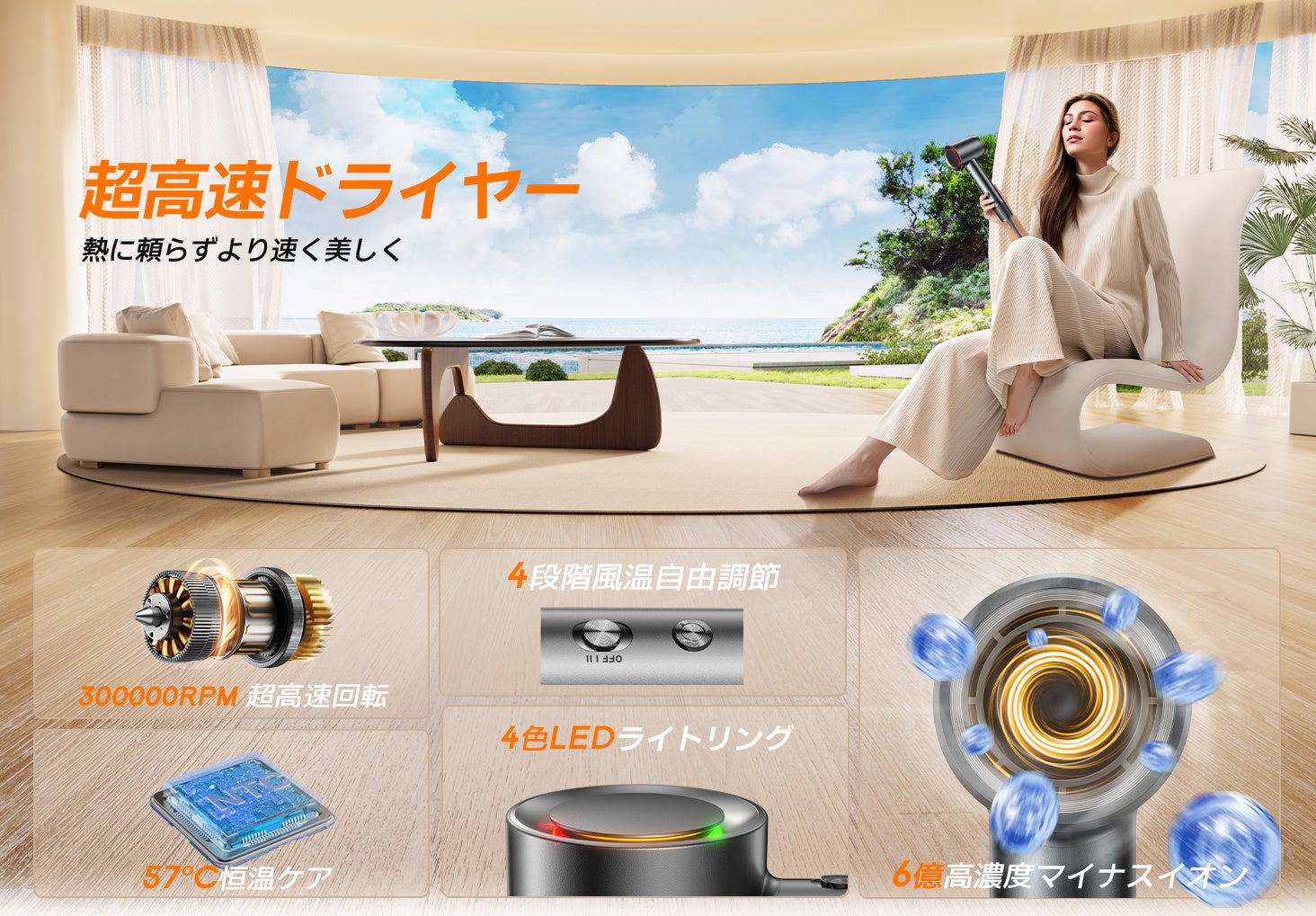 このドライヤーには、熱風、温風、冷風、冷熱循環風の4段階の温度調整機能が備わっています。革新的なLEDリングデザインにより、各モードが一目でわかりやすく表示されます。さらに、NTCスマート温度制御センサーが1秒間に110回の精密な温度調節を行い、髪に高温ダメージを与えずに速乾とヘアケアを実現します。