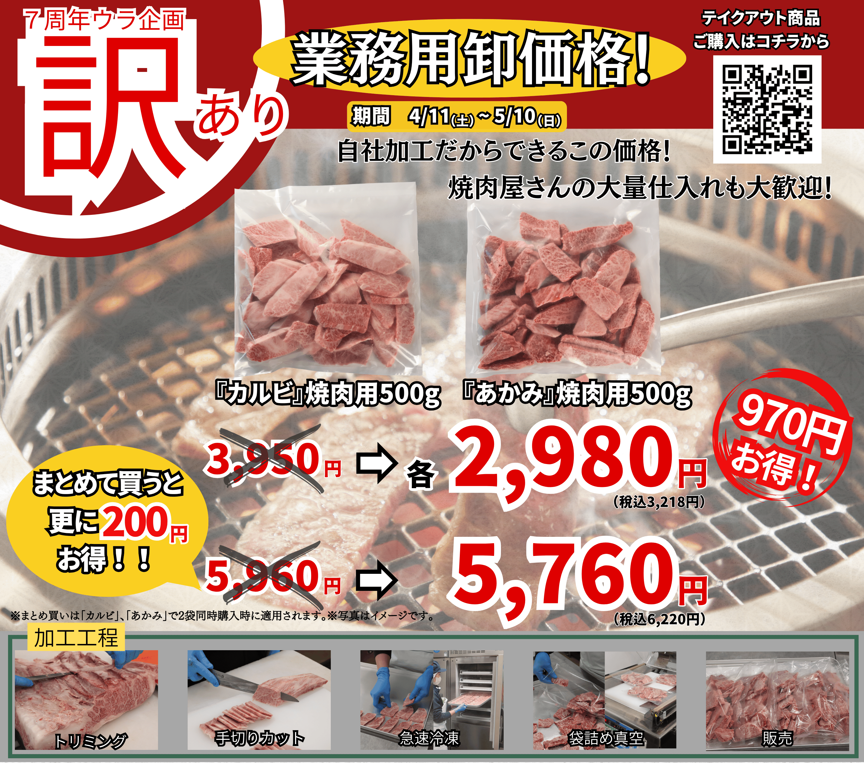通常価格より970円もお得な「業務用卸価格」で、ご用意いたします。「カルビ」と「あかみ」を2袋同時購入していただくと5,760円と、さらに200円お得に!