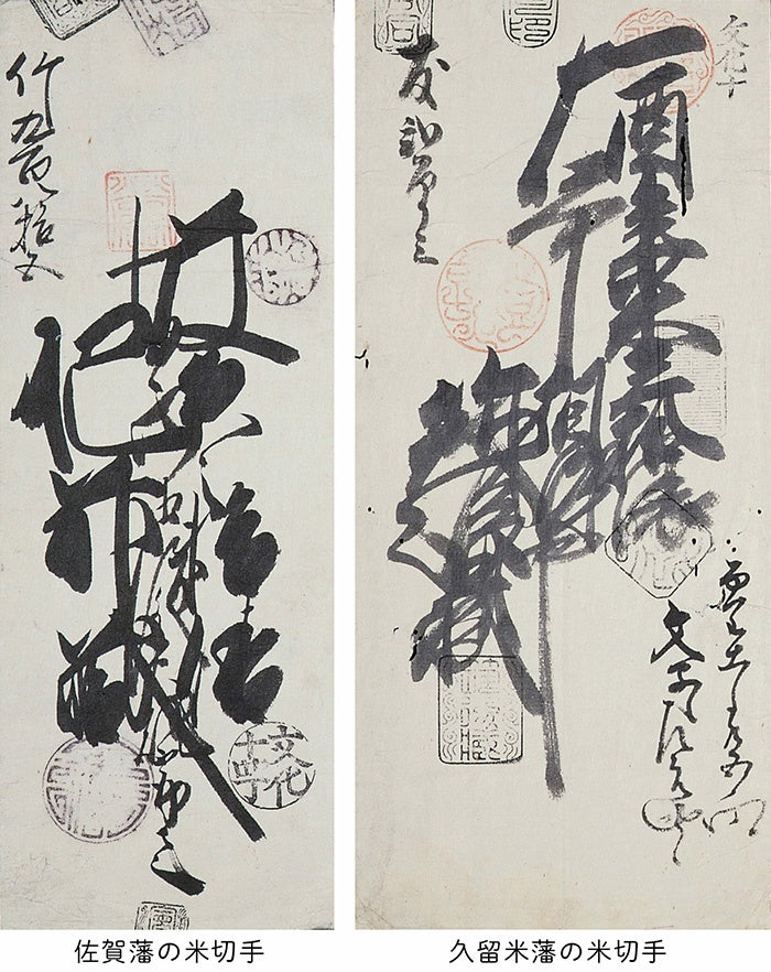 諸大名は領地から運んだ年貢米を大坂の蔵屋敷に持ち込み、入札によって米を取引しました。落札した商人に渡された証券が米切手であり、切手に記された藩の蔵屋敷で米と交換することができました。この米切手が米市場で盛んに売買されました。