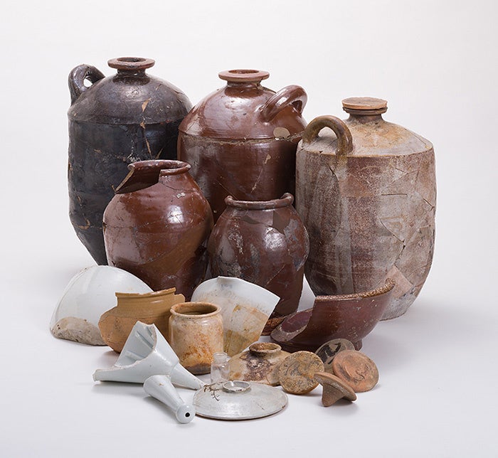江戸時代に蔵屋敷が集中した中之島は、水運による物資運搬に適していました。このため明治時代前半になると、中之島には様々な工場が建てられました。津山藩蔵屋敷のあった敷地では、強酸性の硫酸を保存した硫酸瓶(りゅうさんびん)をはじめ、薬品容器や実験に使う化学陶磁器が見つかりました。これらは造幣局などで生産した硫酸を原料としてソーダ製品や晒粉(さらしこ)、肥料などを製造する化学工場で使われたとみられ、大阪の近代産業の幕開けを示す貴重な資料です。