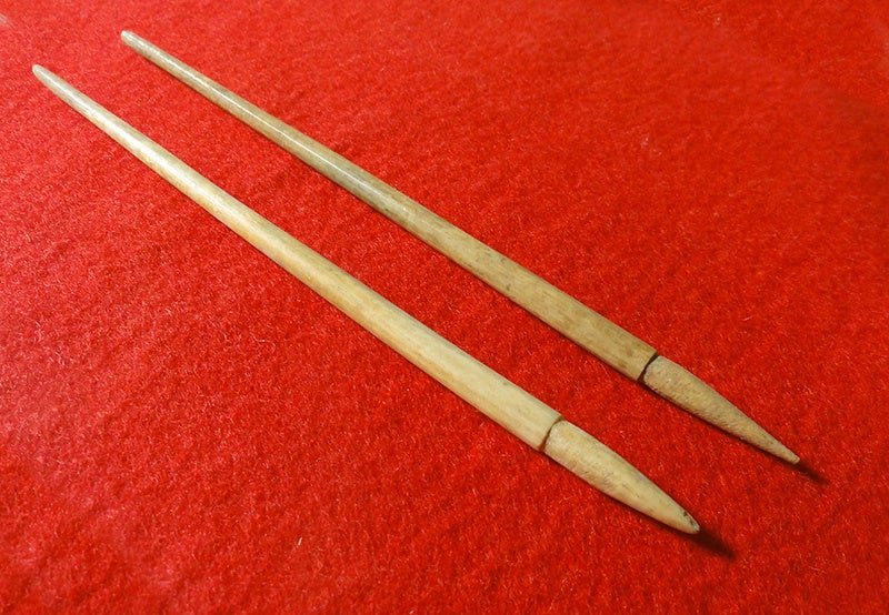 角筆は墨を使わず筆圧だけで文字を書く筆記具です。高松藩蔵屋敷跡から見つかった角筆は牛馬骨製で全長15.3cm(写真前)、15.9cm(写真奥)のものであり、毛筆を精巧に模しています。角筆で記した文字は紙を光に透かさないと見えないため、秘密の記録に使われました。一例として、明治2年に高松城内で起こった抗争の際、旧高松藩士が角筆のみで記した獄中記が残されています。