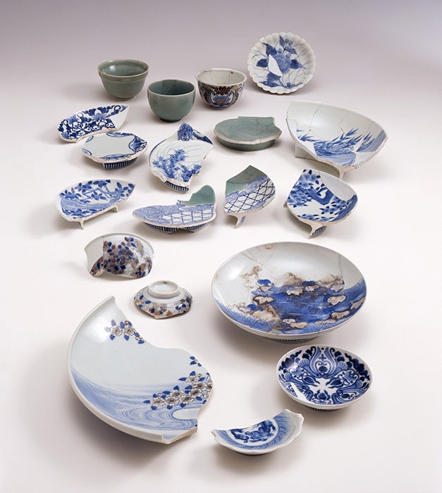 「鍋島」は、江戸時代に佐賀藩の藩主である鍋島家によって作成された特別な磁器です。将軍家への献上を主な目的とし、利益を度外視して作られた最高水準の磁器でした。一般市場には出回らず、発掘調査で見つかることは稀ですが、佐賀藩蔵屋敷跡の発掘調査では総数354点もの鍋島が出土しました。特に盛期の作品は、原料となる陶石、成形・焼成に至るまでこだわり抜かれています。出土品の多くは、蔵屋敷が大火の被害を受けた際に捨てられたものであり、表面の細かな傷痕から実用されていた可能性が高いと考えられています。