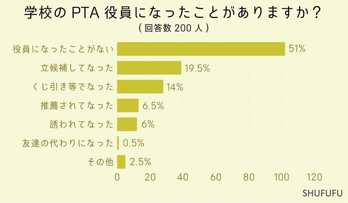 学校のPTA役員になったことがありますか?の問いに対して最も多かったのが「役員になったことがない(51%)」でした。 次いで「立候補してなった(19.5%)」「くじ引き等でなった(14.%)」という結果でした。半数以上の方が役員になったことがないようです。