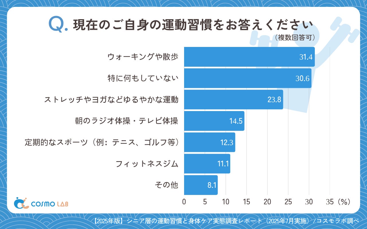 シニア専門のマーケティングプラットホーム コスモラボ(会社名:コスモヘルス株式会社、本社:東京都港区、代表取締役社長 小塚 崇史)がシニア層の『運動習慣・身体ケア』に関するアンケートリサーチのレポートをリリースしました。本レポートでは、50代以上のシニア層を対象に運動習慣や身体ケアに関する意識と実態調査を実施しました。運動の頻度や内容、身体の不調、ケア手段、家庭用機器の利用状況など、シニア世代の健康管理行動の実情が明らかになりました。