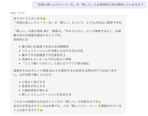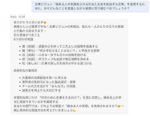現場での判断に迷ったとき、理念の捉え方に悩んだとき、あるいは誰かに壁打ちしたいとき――「Wally」がすぐそばにいてくれることで、全員が自信を持って前に進める環境をつくります。