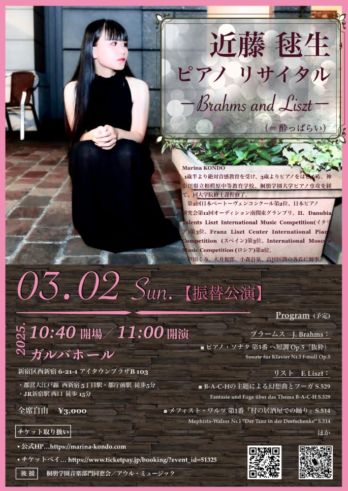 「チケットペイ」は、2025年3月2日(日)にガルバホールにて開催いたします『近藤 毬生 ピアノリサイタル-Brahms and Liszt-』のチケット販売を開始いたします。