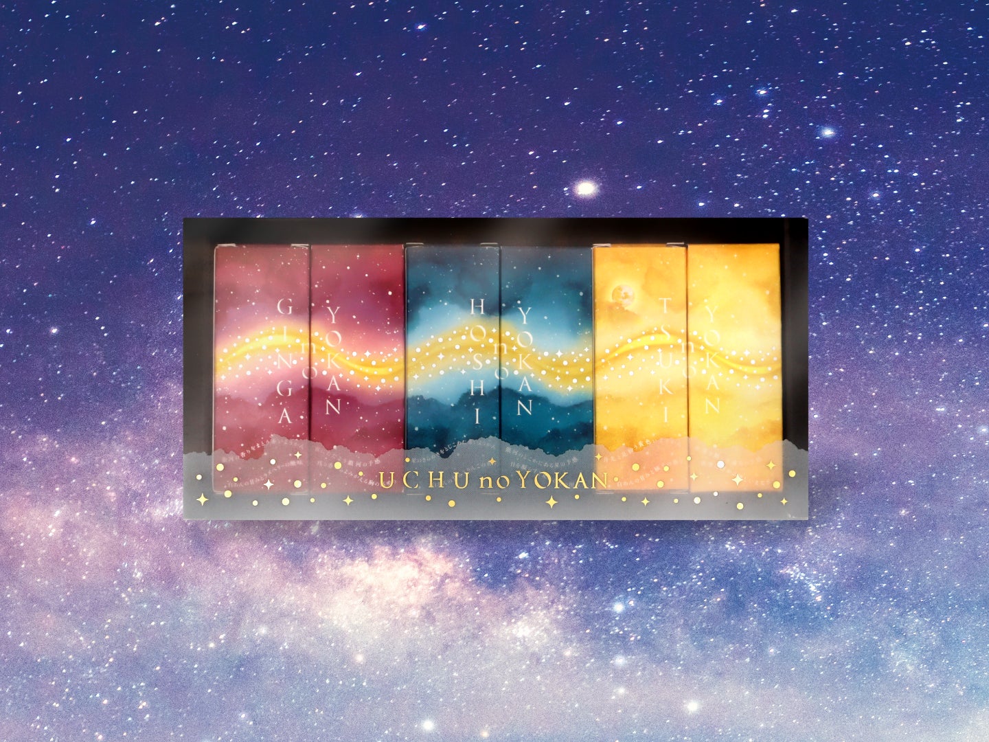 「Gallery Planetaria」オリジナル羊羹【UCHU no YOKAN】シリーズ。『GINGA no YOKAN』と『HOSHI no YOKAN』と『TSUKI no YOKAN』がそれぞれ2個ずつオリジナルの化粧箱に入った羊羹6個セット。