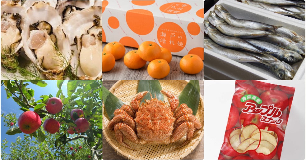 かにや帆立などの海産物、みかんやりんごなどの果物の販売を行います。また、いか焼きや蒸し牡蠣などその場で調理したものも販売いたします。是非会場にお越しいただき、各都市の名産品、特産品をご堪能ください。