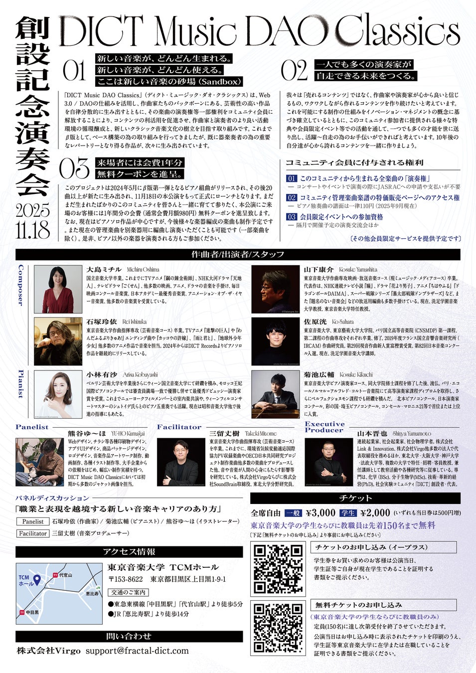 東京都渋谷区のDICT CUBE TOKYOを本拠地とする、Web 3.0 / DAOによる共創イノベーションのための社会実験コミュニティである「DICT」(運営会社:株式会社Link & Innovation)から派生した音楽出版社である株式会社Virgo(東京都渋谷区)は、「新しいクラシック音楽文化を共創によって樹立する 作曲家と演奏者のためのサンドボックス・コミュニティ」である「DICT Music DAO Classics」の創設を記念して、2025年11月18日に東京音楽大学TCMホールにて開催する「DICT Music DAO Classics 創設記念演奏会」のプログラムを決定し、公開致しました。