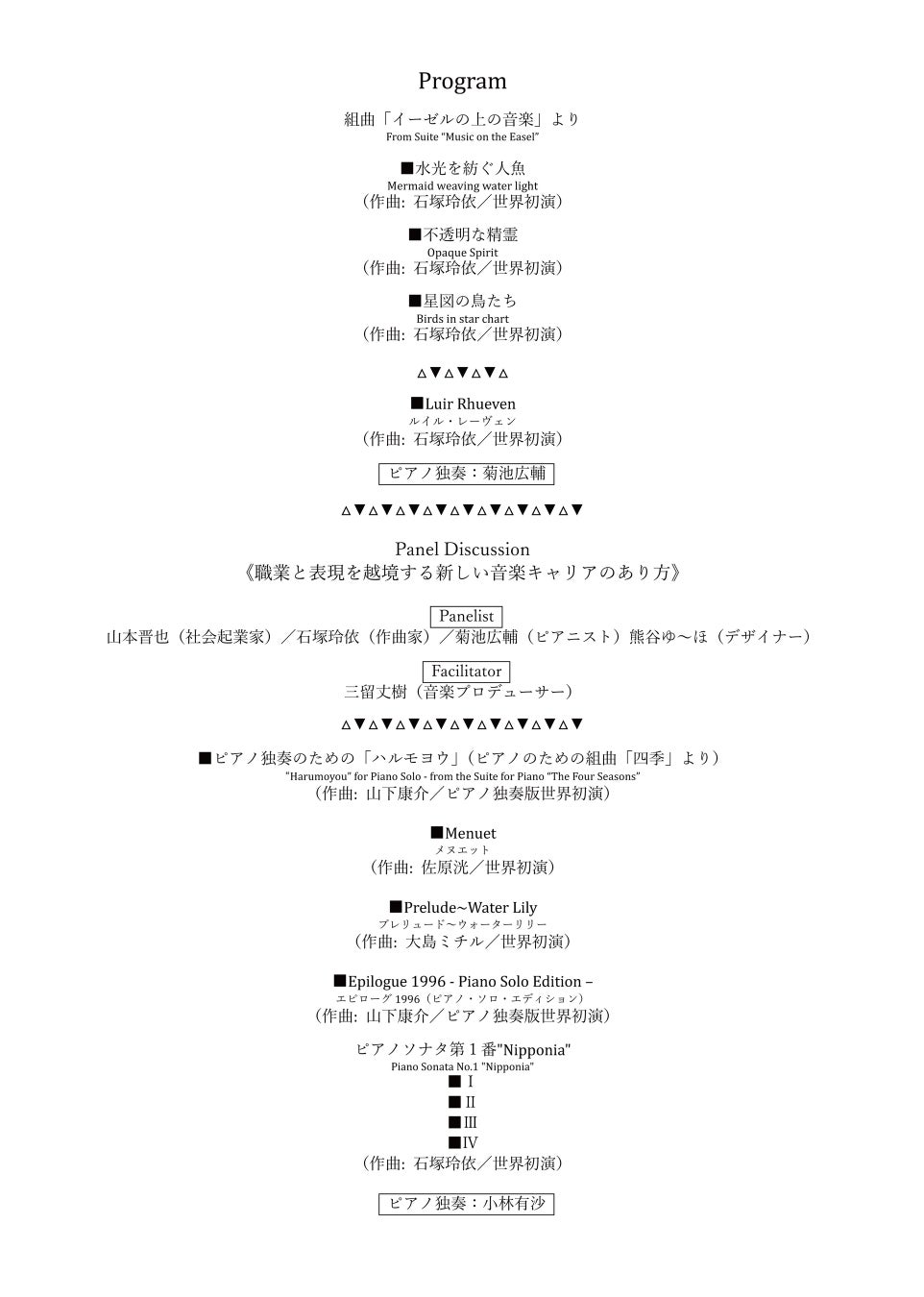 今回開催される演奏会では新たに大島ミチル、山下康介などの世界的な作曲家も新たに参加し、新曲を書き下ろしました。全曲「世界初演」で構成されるプログラムは以下の通りです。
