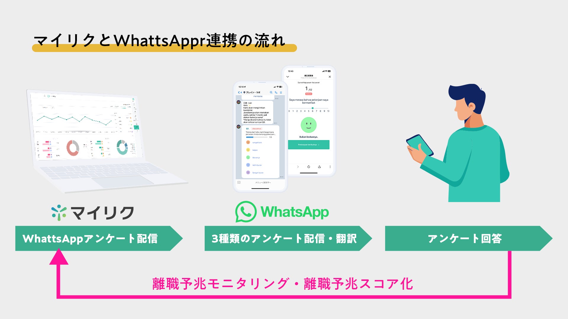 パルスサーベイ、eNPS調査、従業員満足度調査の3種類のアンケートを、外国人材が日常的に利用するWhatsAppへ直接配信。