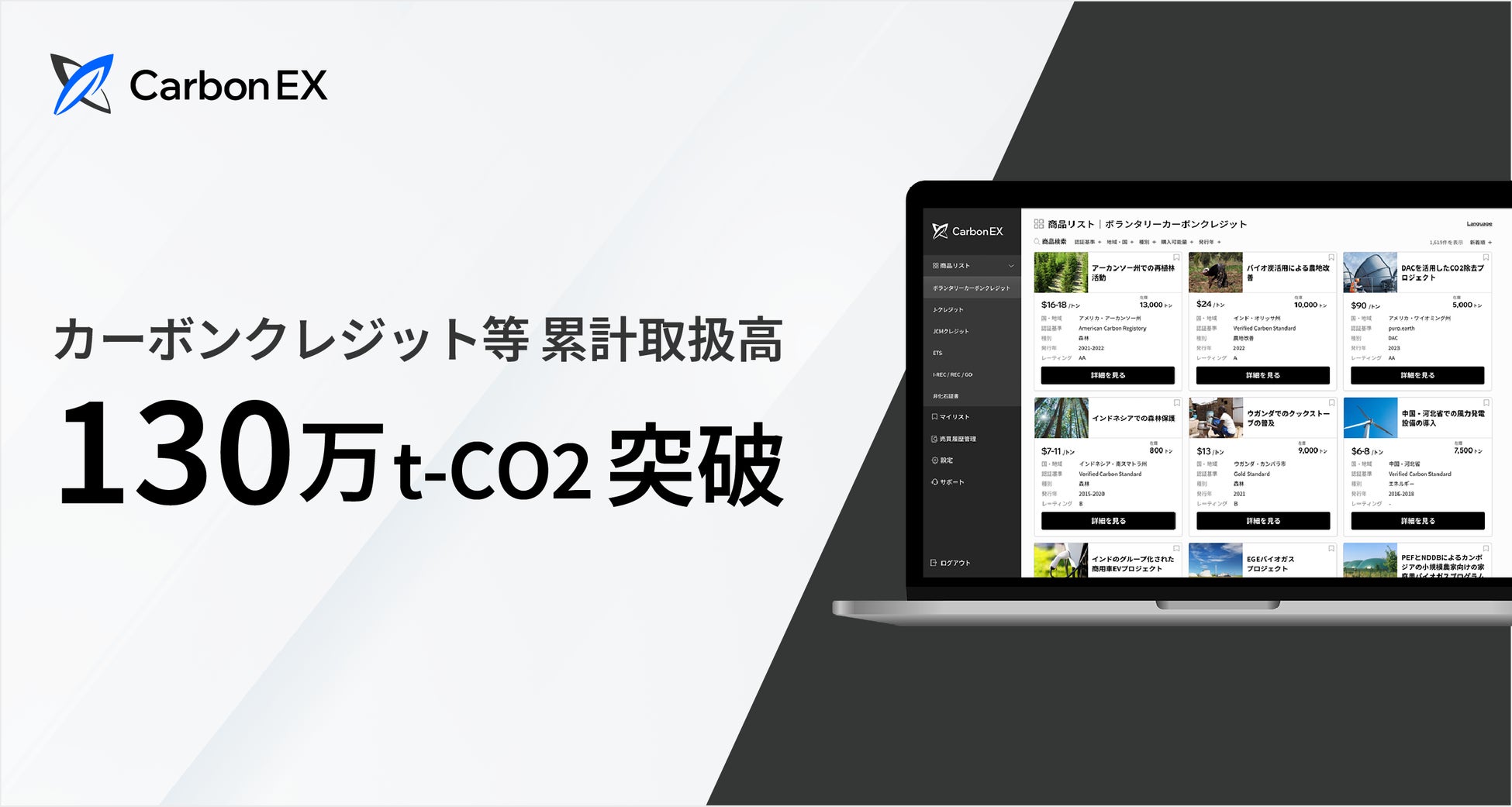 Carbon EX、カーボンクレジット等の累計取扱高が130万トンを突破