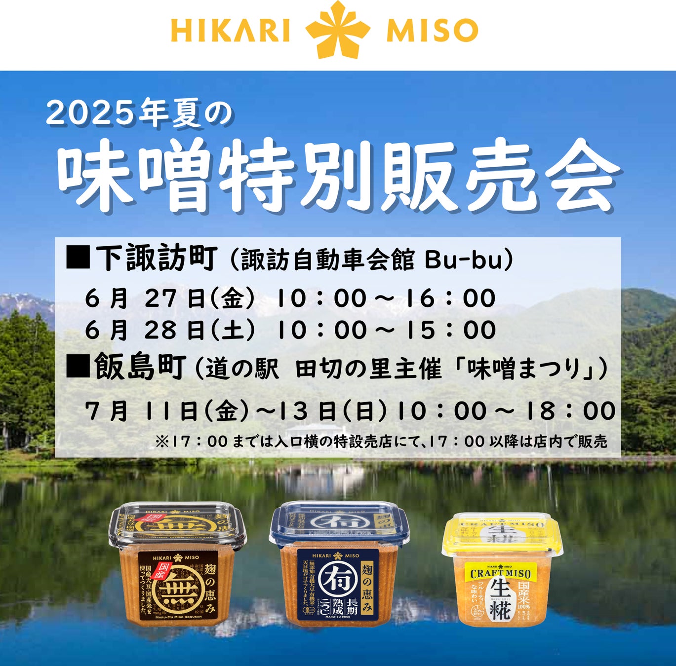 ひかり味噌株式会社※(長野県諏訪郡下諏訪町、代表取締役社長 林 善博 以下、当社) は、本社が立地する下諏訪町と工場を構える飯島町にて、毎年恒例の夏の味噌特別販売会を開催いたします。オーガニック味噌のリーディングカンパニーである当社自慢の有機JAS認証の大豆と米で作った『マル有 有機味噌』を始め、そのまま食べておいしい“クラフトみそ”の、新穀の米と大豆を贅沢に使用し、年に1度数量限定で仕込む希少な限定醸造味噌『CRAFT MISO 生糀 Precious 400g』などを、会場限定のお得な特別価格で販売いたします。長野県内外のお客様で賑わう下諏訪町の「諏訪自動車会館Bu-bu」と、地元の名産品が揃う飯島町「道の駅 田切の里」の2会場で開催し、長野県にて事業展開する企業として地域の皆さまへの日頃の感謝の気持ちをお伝えすると同時に、味噌の魅力を広く発信いたします。