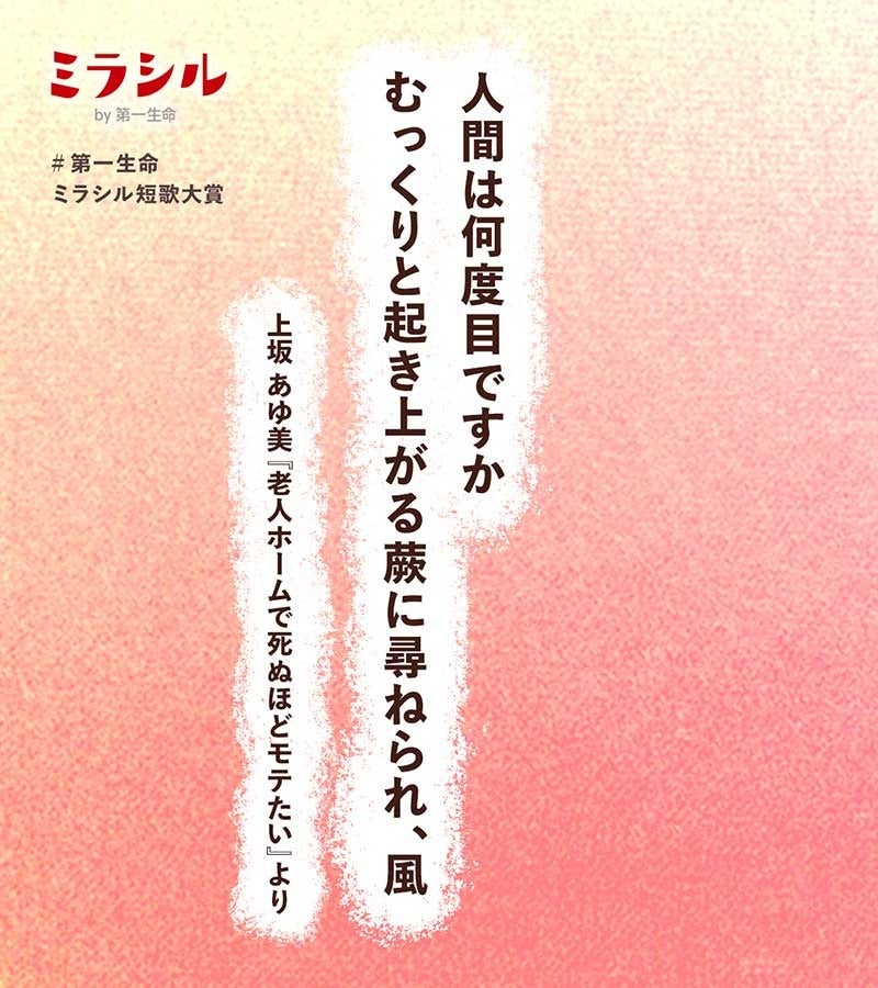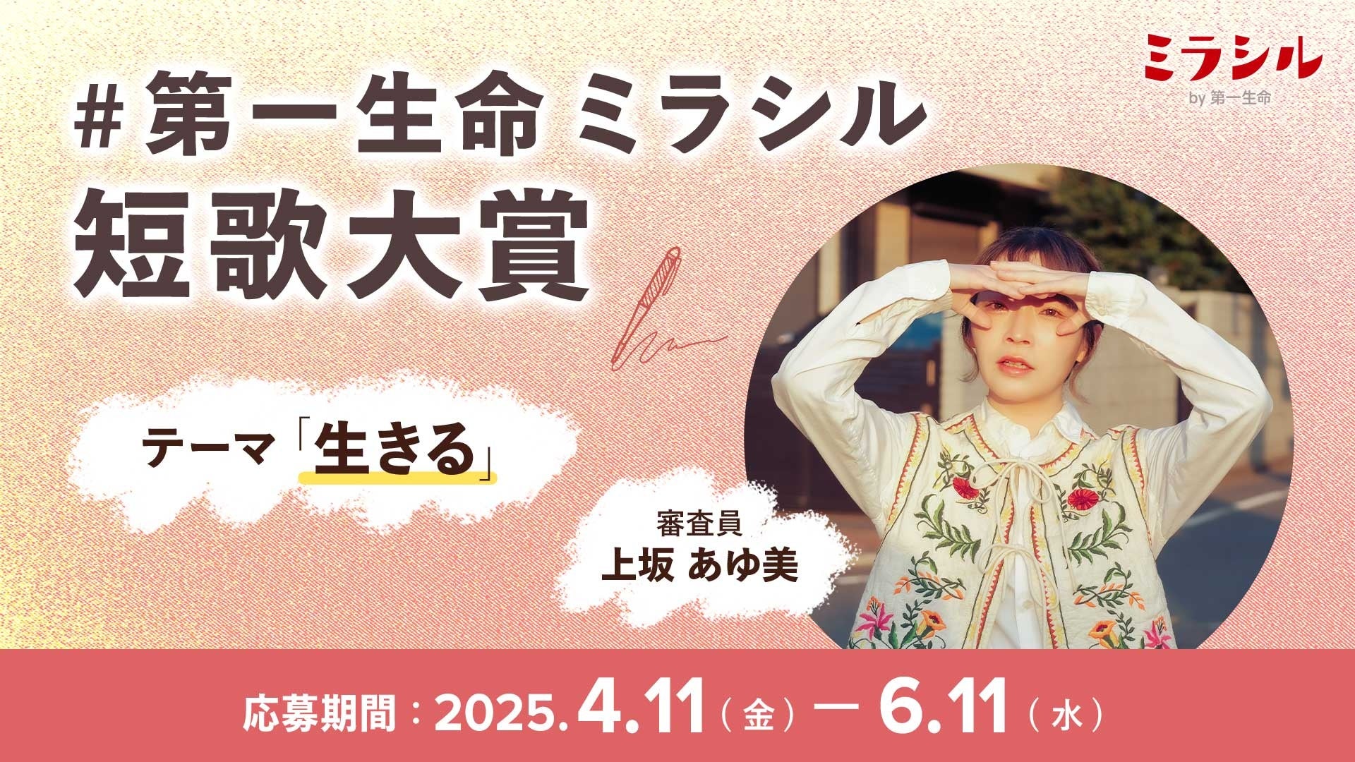 第1回となるこの「#第一生命ミラシル短歌大賞」では、書籍『老人ホームで死ぬほどモテたい』(書肆侃侃房・2022年)で注目を集める歌人・上坂あゆ美さんを審査員に迎え、「生きる」をテーマとした一般の方からの短歌を募集します。