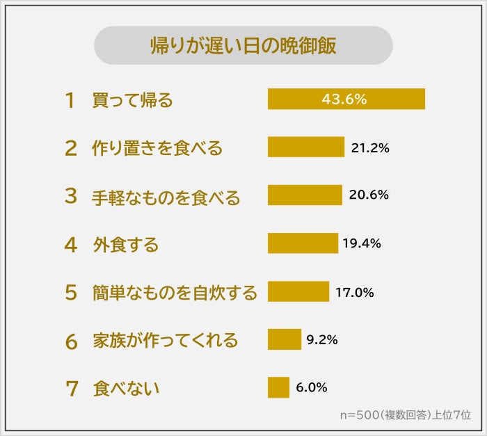 社会人の男女500人に「帰りが遅い日の晩御飯はどうするか」を聞いたところ、圧倒的1位は「買って帰る(43.6%)」でした。2位「作り置きを食べる(21.2%)」、3位「手軽なものを食べる(20.6%)」、4位「外食する(19.4%)」が20%前後で続きます。