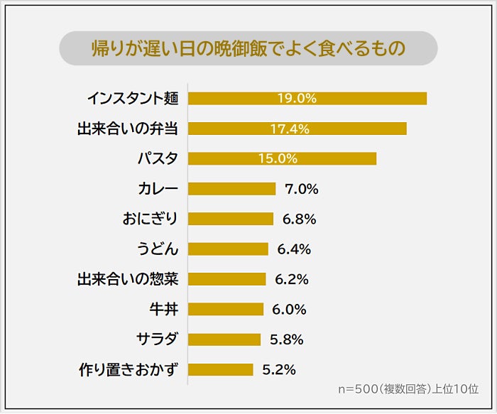 「帰りが遅い日の晩御飯でよく食べるもの」の1位は「インスタント麺(19.0%)」でした。2位「出来合いの弁当(17.4%)」、3位「パスタ(15.0%)」が続きます。