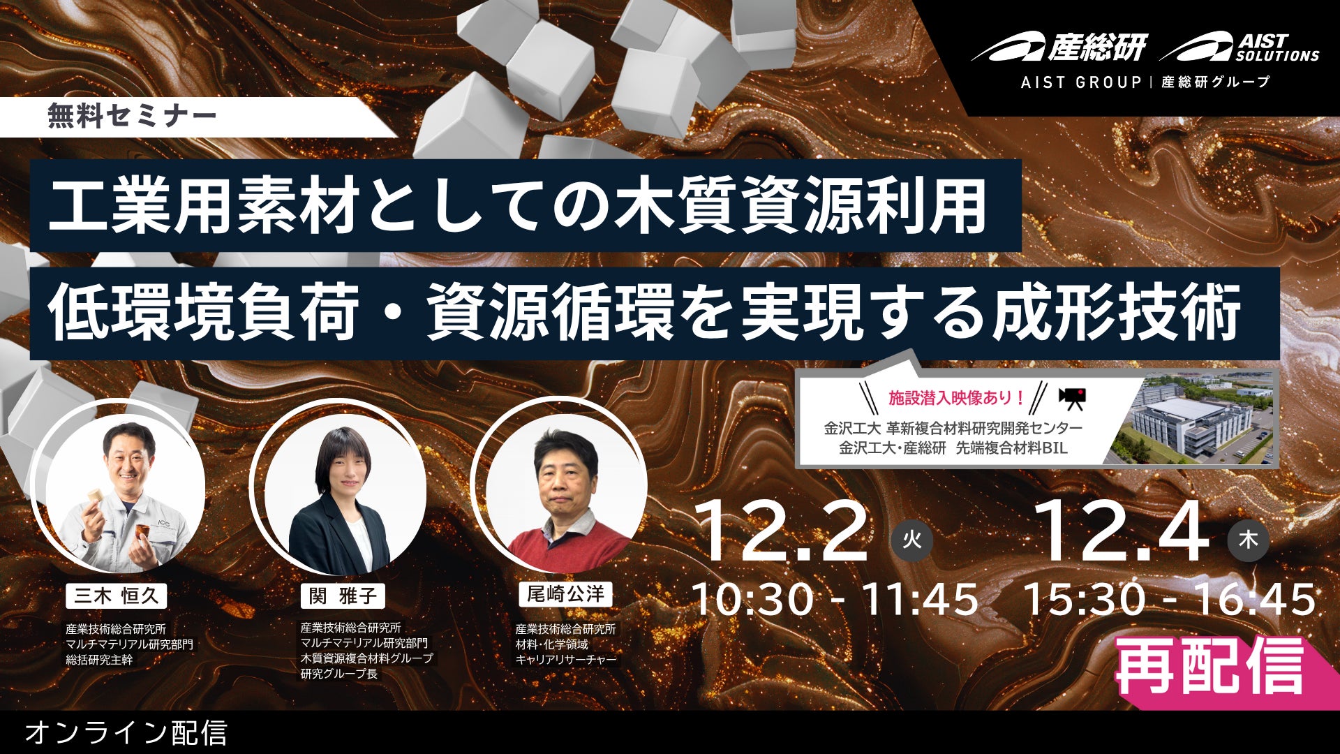 地球環境問題への関心が高まるなか、CO₂排出抑制や化石資源依存からの脱却に貢献する「木質資源」が注目されています。産総研では木質系素材の微細構造とその変化を活かした処理・加工技術の研究開発に取り組んでいます。本ウェビナーでは木材に関する基盤技術をもとに開発された「木質流動成形技術」に加えて、金沢工大・産総研先端複合材料ブリッジ・イノベーション・ラボラトリの現地取材映像とともに新規建材や自動車部材への展開を目指したマルチマテリアル化の取り組みを紹介します。