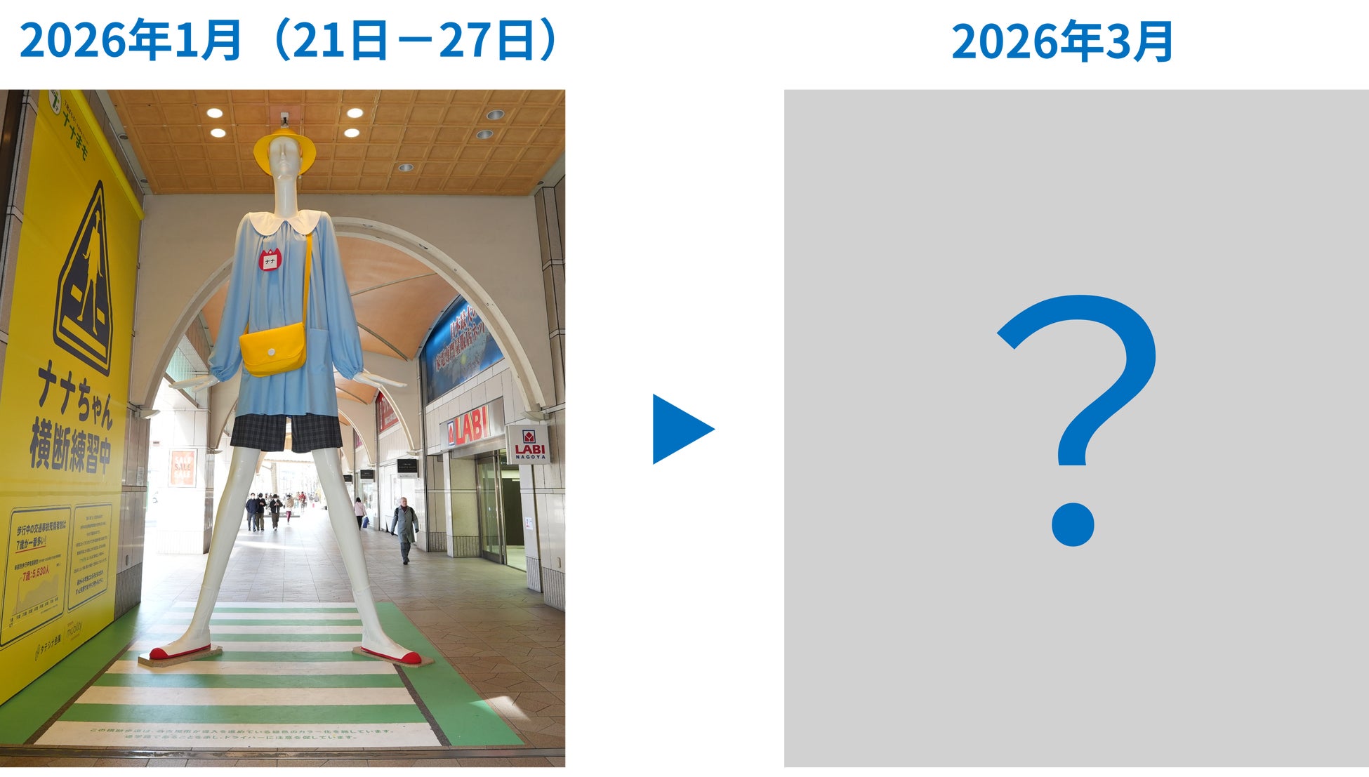 2026年1月21日(水)から1月27日(火)までの1週間、4月の入学前の備えを呼びかける目的で、ナナちゃん人形が「横断歩道を渡る練習をする園児姿」に変身します。
