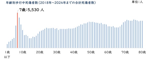 交通事故総合分析センター(ITARDA)のデータからの累計(2018-2024年)によると、歩行中の事故死傷者数が最も多い年齢が「7歳」となっており、小学3年生頃に該当する9歳頃までの事故死傷者数が突出しています。