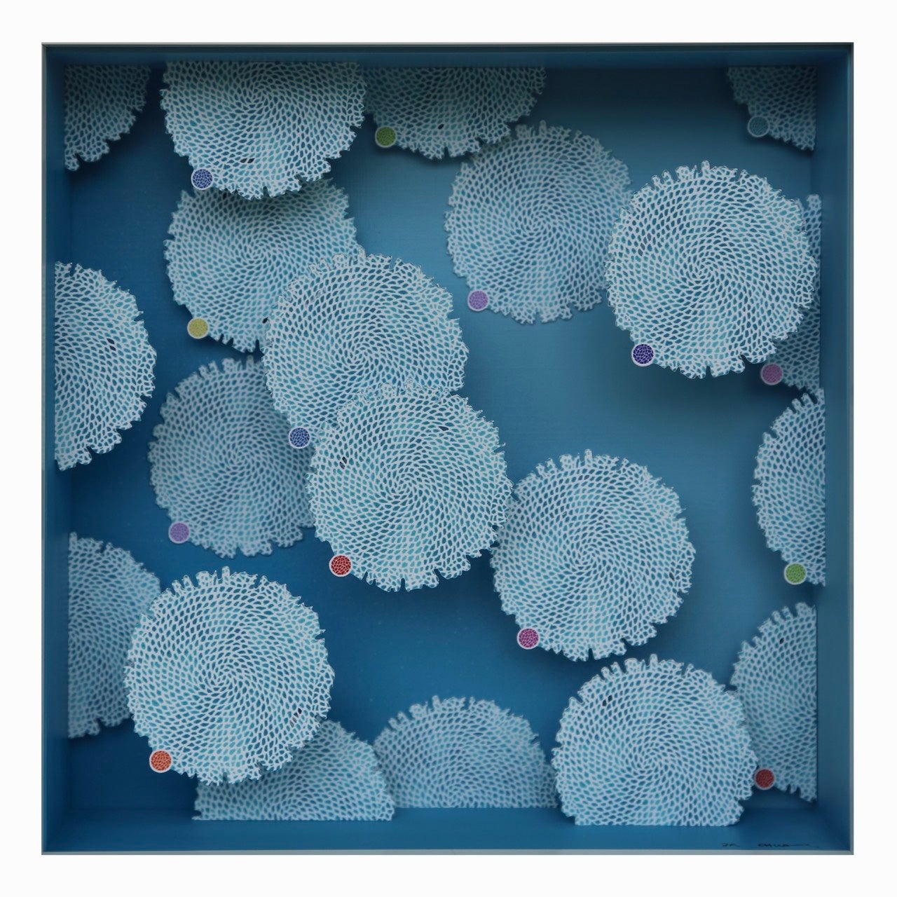 本展の作品は、環境の変化に応じて形を変え、漂いながら生きるサンゴ礁の構造やパターンに着想を得ています。その有機的で繊細な幾何学は、無数の切り込みを重ねることで脆くも均衡の取れた構造を生み出す、私自身の制作のリズムと共鳴しています。